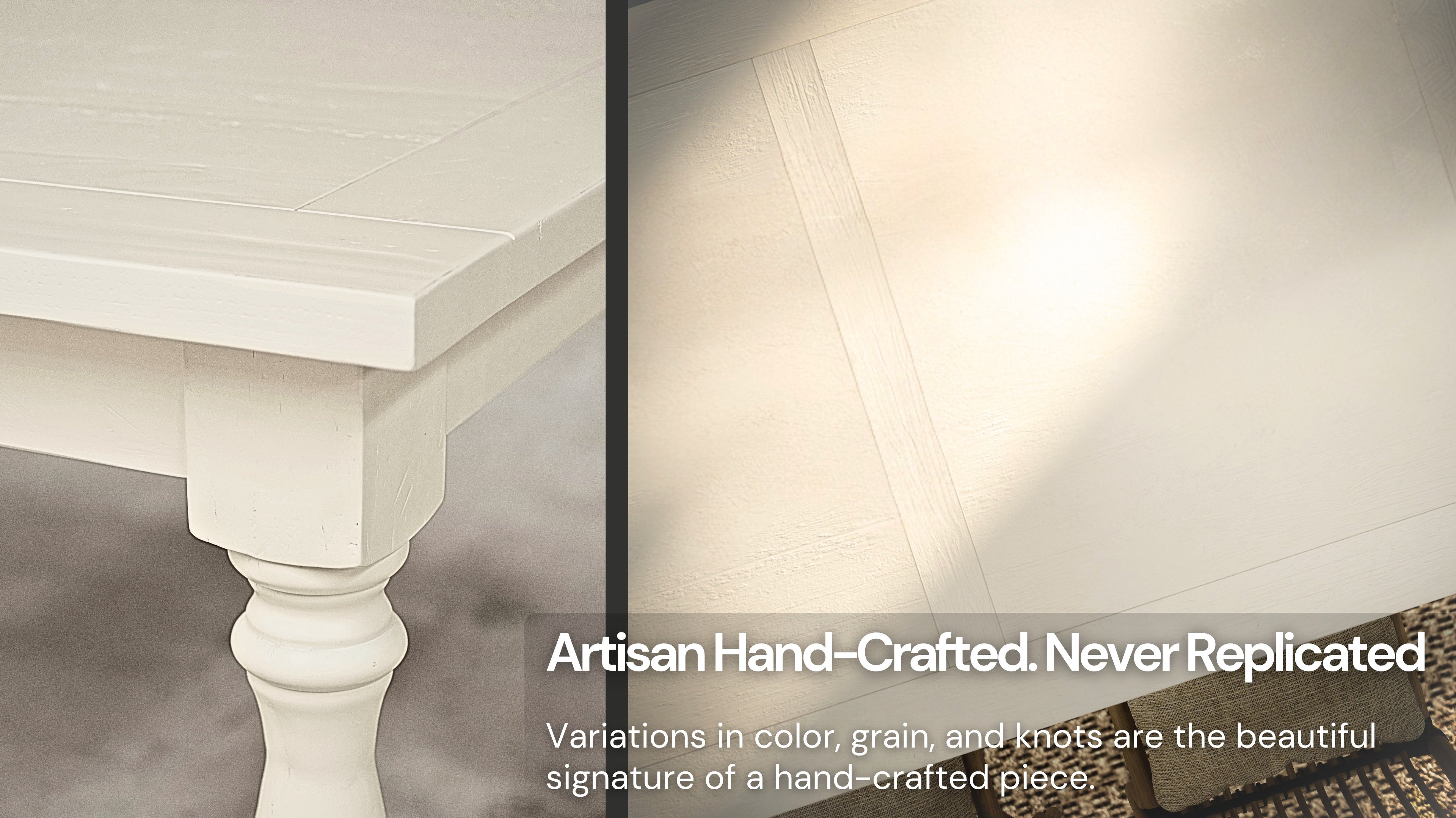Handcrafted from solid upcycled and reclaimed pine wood, this table celebrates the natural character of real wood through visible grain patterns and artful imperfections. The creamy white oak finish enhances these organic details, creating a piece that's both visually striking and environmentally responsible.
