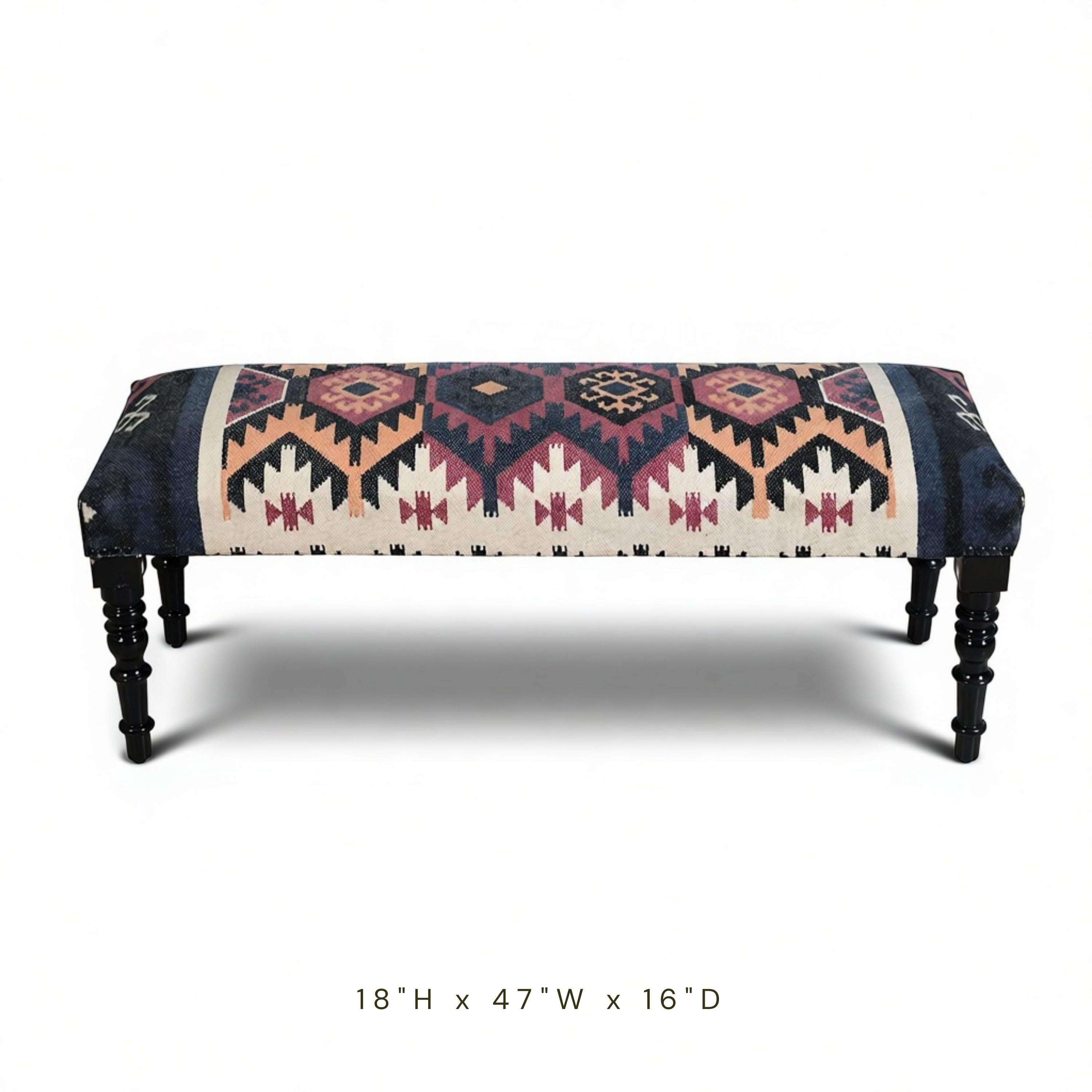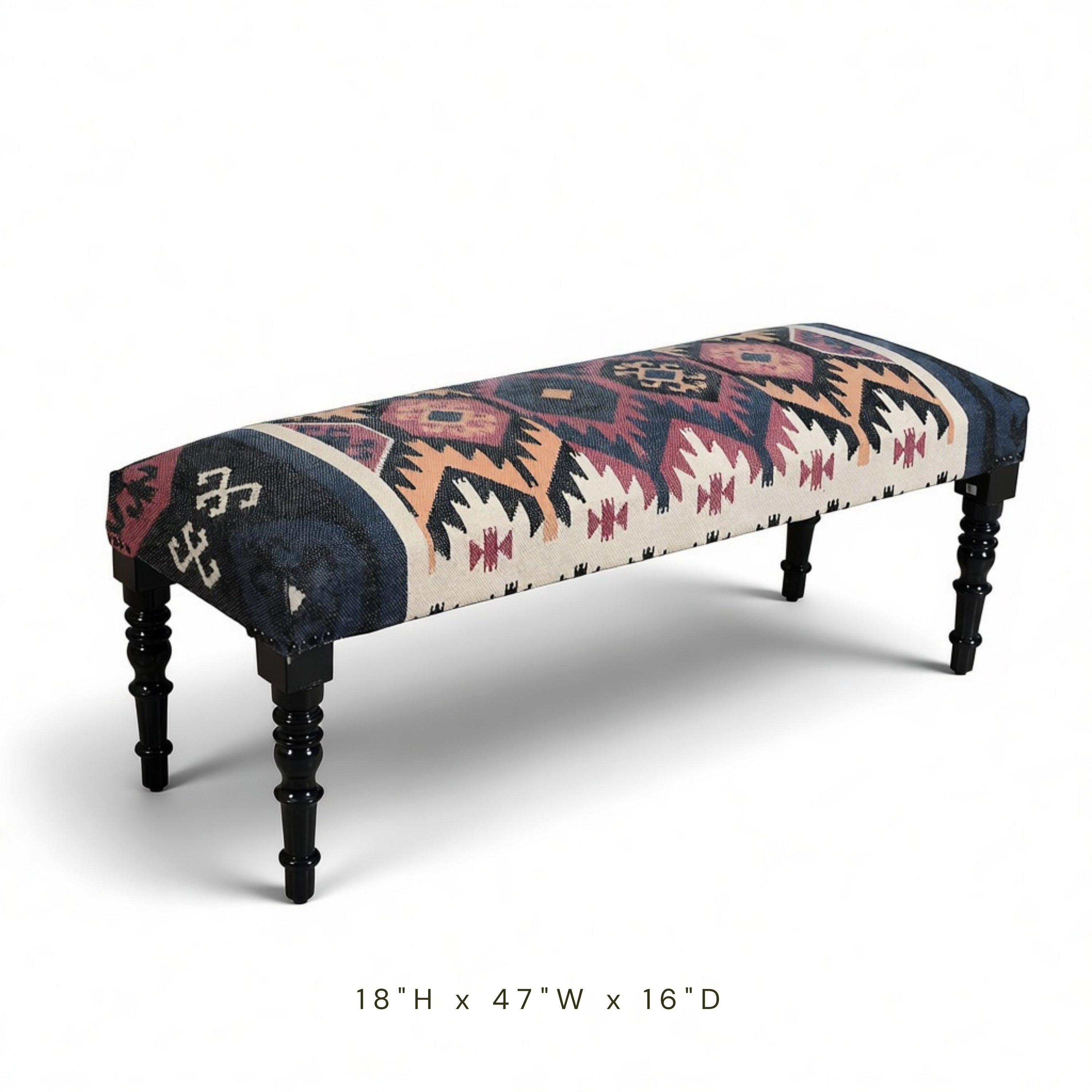 Introduce warmth and character to your home with our Rustic Farmhouse Handwoven Bench. This piece masterfully brings a cozy farmhouse feel with a modern touch to your living space. By pairing a detailed, Southwestern-inspired woven seat with sleek black wooden legs, this bench creates a timeless look that fits beautifully in both rustic cabins and contemporary urban interiors.